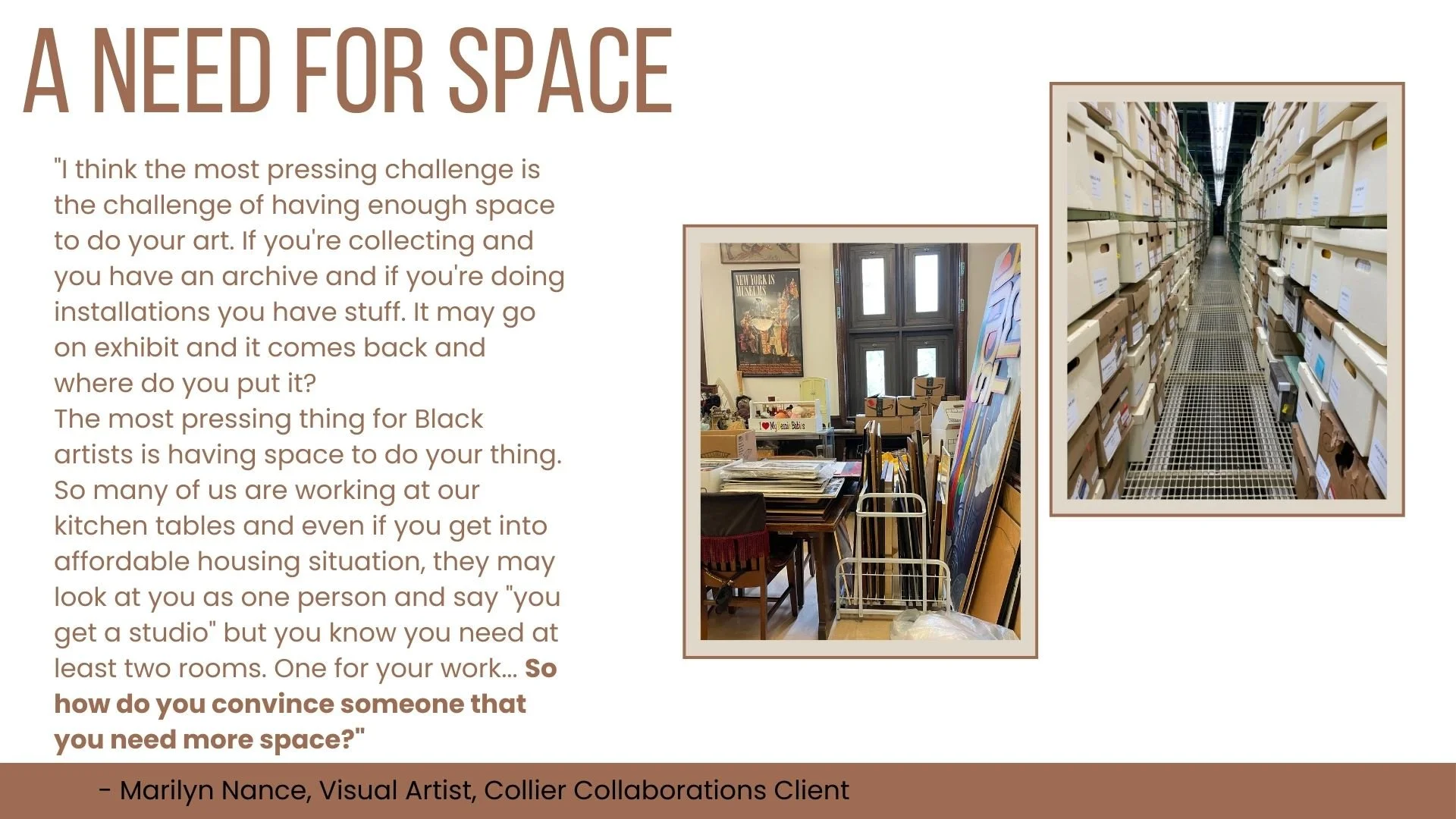 During my time as a New INC member, I explored the need for community-owned archival storage solutions especially for Black communities. Far too often Black cultural heritage materials either go uncared for, end up outside of their communities of origin, or are otherwise destroyed or lost. At present, there are no Black centered archival storage solutions and no archival storage solutions that prioritize care over capital.